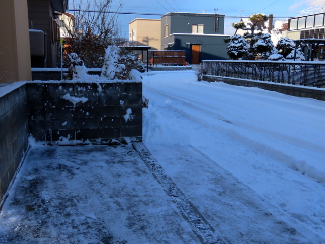 12/27 昨日午後から降り始めた雪は根性に乏しく今朝までにほんの数cm。楽勝かと思われた。しかし夕べご近所さんたちが団体で契約している排雪業者(私はスノーヤクザと呼んでいる)がやってきた。住宅街の細路にも恐ろしくでかいダンプや重機を持ち込み,契約しているお宅の雪は持っていくが,近辺の街路をメタメタにしていく。それが朝にはシバレ上がって,その後始末をお爺さんがすることになる。今朝は6時半ころから50分ほど大汗。いい運動になった。こん畜生!