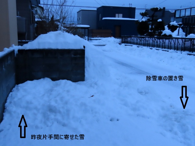 油断できない。起きるとしっかりと除雪車の置き雪。これが岩のように硬くて悲鳴を上げた。今冬一番の大汗。