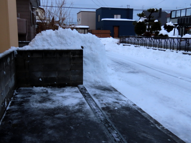 駐車スペースに一時保管した雪山は,なにがなんでも排雪に持ち去られてしまいたかったお爺さんは必死だった。今年は2/14に初登場した花畔岬は,5日間で見る間に大きく育った。固く締まった雪山から角スコップで四角く切り出し城塞のように岬に並べ,かつ積み上げる。雪国人民の醍醐味でありかつ助けて欲しいよ,ったく。