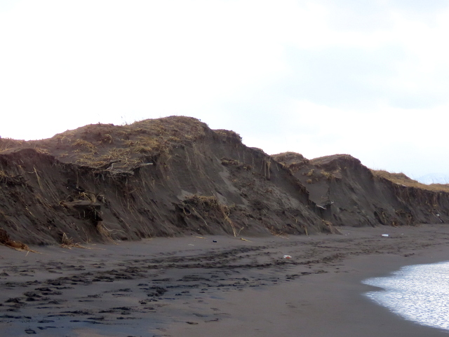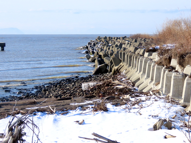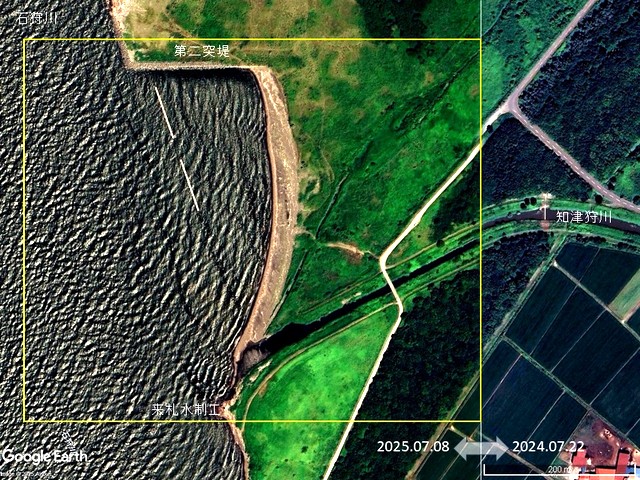 私が勝手に夢想する石狩川河口論からすると,ここは小石狩湾岸(つまり海岸)の北側出口というべきところなのだが,これまでの定説に固執すれば石狩川右岸(つまり河岸)ということになり,ややややこしい。海岸か河岸かはともかくとして,従来ここは一貫して侵食され,汀線(岸)が後退し続けてきた。その汀線後退の局面は昨2024年秋まで続く。[ちなみに,GoogleEarth におけるこの近辺の背景画像の取得日は2024/7/22。つまり最も汀線が後退した時期の画像ともいえ,貴重な資料となりうる]