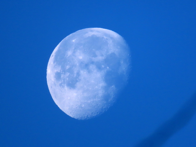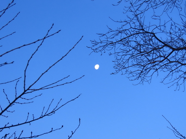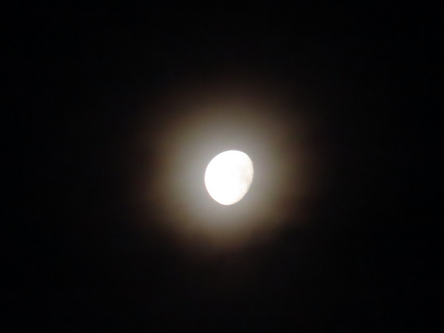 満月が過ぎ月齢18くらいのやや欠けた月だったが,6時半ころ周りに白い輪が。月暈(げつうん)だろうか?だとしたら吉兆に違いない。