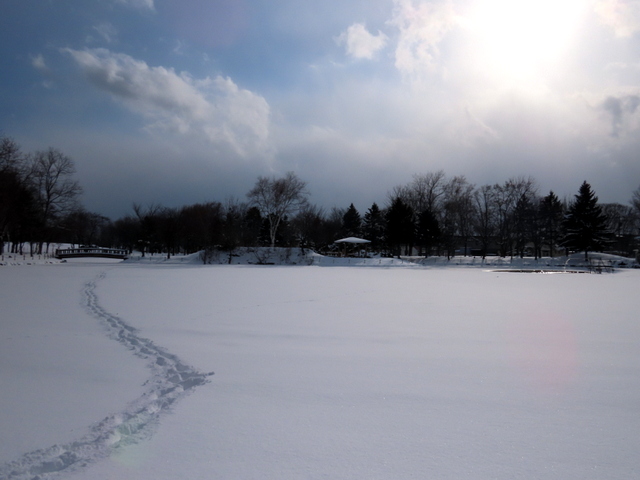 (d,e) まったく関係なく,1/16の紅葉山公園。南池の南端から中島を望む。たかだか18分しか違わないのに,(e)では(d)にはない何者かの足跡が残されていた。大汗をかいた。