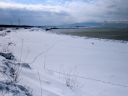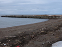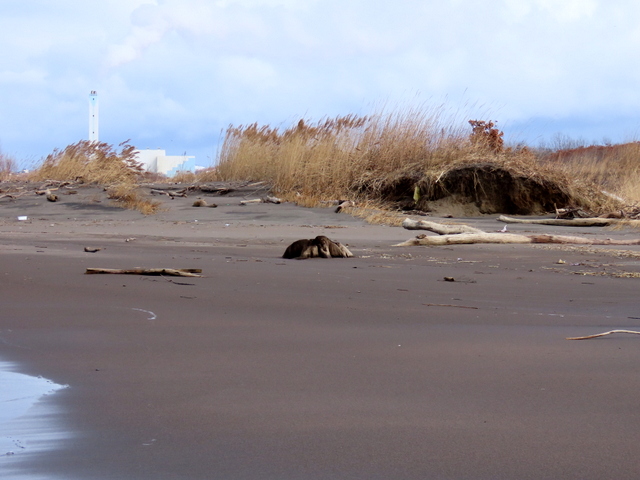 1/29には石狩川の川岸(浜)は全面雪氷に覆われていたが,2/24では奥まった浜崖の近辺にのみ僅かに残雪がある程度で地表の砂がほとんど露出していた。雪氷が解けたり流されたりした分だけ,汀線が後退しているように見える。実際にも2/19未明の有義波高6m(ナウファス・石狩湾新港)に及ぶ大時化で侵食されたのかもしれない。