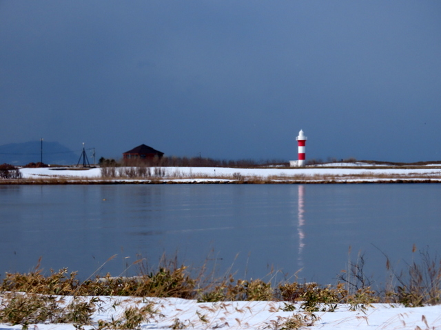 (a) 八幡堤防からの石狩灯台。鏡のような川面。にもかかわらず,海には烈しい波。