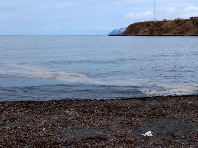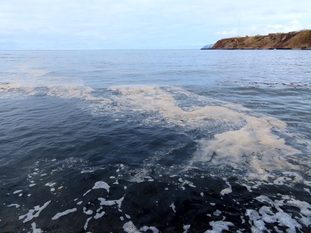 群来の名残りと思われる海面の白濁(c)。