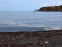 海食崖の上の道の行き止まりから石狩方向を望む。石狩川河口導流堤の先に白濁が伸びている。通常こちら側には群来は発生しないので,潮流と光と陰のいたずらなのだろう。しかし諦めない。さらに厚田方向へと走る。