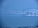 砂嘴先端から北を望むと,手前に愛冠岬,その向こうに雄冬岬(2025.07.23の画像)。今日は雄冬岬は霞んでほとんど見えないが,手前の愛冠岬の先端の鷲岩が浮かんでいる。極寒での下位蜃気楼,浮島現象だ。