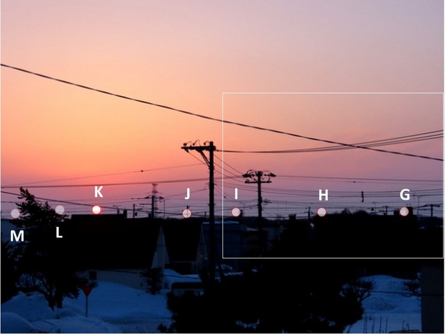 さらに,N画像からは,N点はまとめ-Ⅲ図の範囲から左に逸脱してしまったことが分かる。一連の撮影定点から丸い朝陽が再び観察されるのは半年後ということになる。それゆえに,今回をもってこのシリーズは終了となる。メデタシ,メデタシ。
