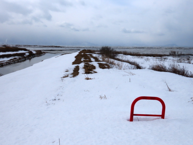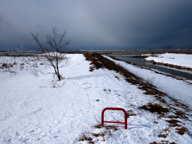 j - 2/24(g) 知津狩新橋右岸側の堤防。こちらも歩きやすく,石狩川への支流・知津狩川の注ぎ口へ。途中滑って尻もちついたけど。。。