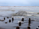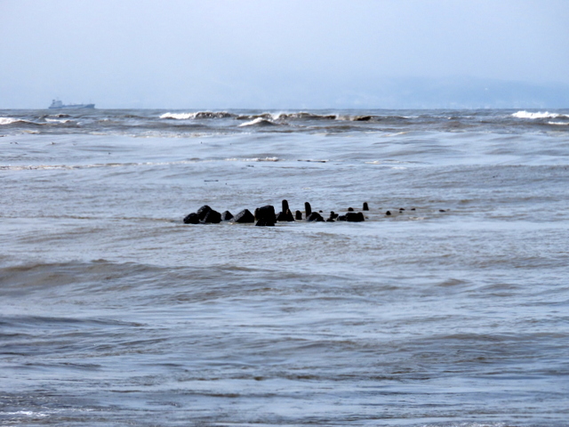 (h) 第三突堤。潮位はやや高めなのだが,荒れた海面が上下するので時に大きく姿を表す。第一突堤は隠れたまま。