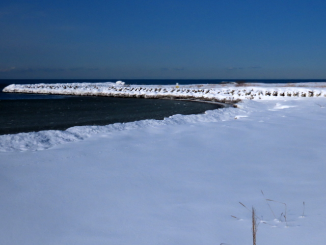望来海食崖の上からの石狩川河口導流堤の先。ここだけは白い筋が伸びている。