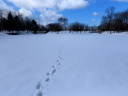 (d,e) まったく関係なく,1/16の紅葉山公園。南池の南端から中島を望む。たかだか18分しか違わないのに,(e)では(d)にはない何者かの足跡が残されていた。大汗をかいた。