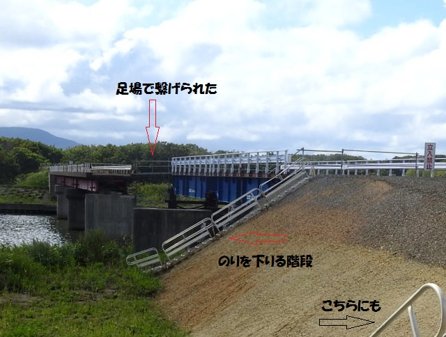 青い仮橋のこちら側に写る赤い手摺り状のものは200mほど手前(上流)にある樋門の構造物で,オタルナイ橋とは無関係。