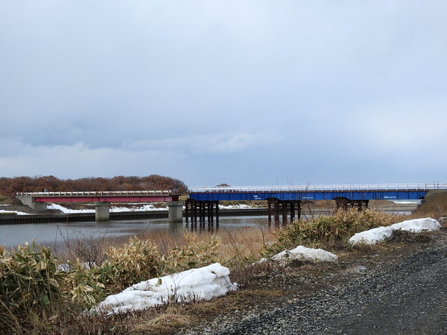 旧・鋼橋の小樽側1径間および木橋を撤去,石狩側の1径間は残してそれに新たに3径間の鋼橋を結合(鋼材の違いが明白)。石狩側河川敷の木橋はそのまま。