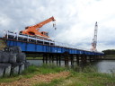 9/28にはようやく資材が搬入されつつあった(Topics)程度なのだが,10/20には巨大なクレーンが設置されていた。下流の仮橋の延長工事と,旧橋の次の径間の解体作業が同時に進行していることがわかる。