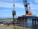 巨大なクレーンが2台動作中。下流側に敷設されている仮橋の延長工事に取り掛かっているようだ。