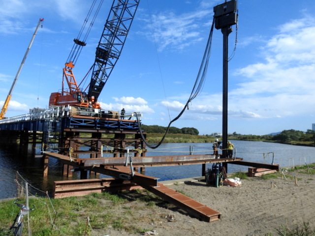 仮橋橋脚の基礎鋼?が4本打ち込まれていた。