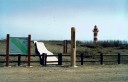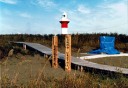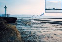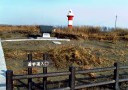 1999.04.11 田中實氏撮影。倒壊直前の石狩川口灯台。それだけでも極めて貴重な写真だが,その上対岸(左岸)の遠景にとても小さいながら移設改修後の石狩灯台も写っている(右上隅に拡大処理)。石狩灯台と石狩川口灯台とが同時におさまっているツーショット画像は,その意味でも稀少,かつ貴重なものといえるだろう。