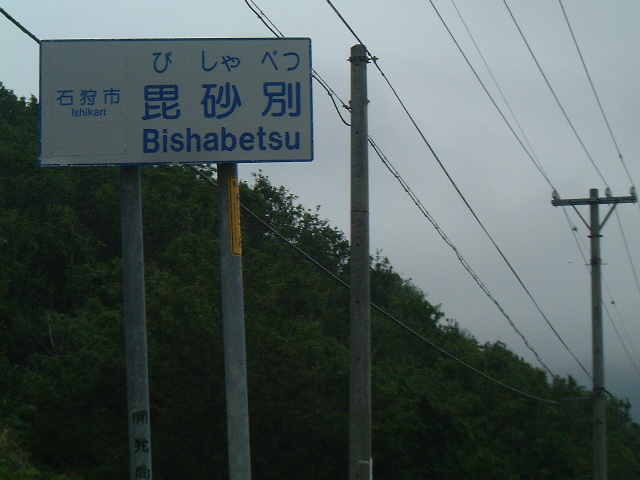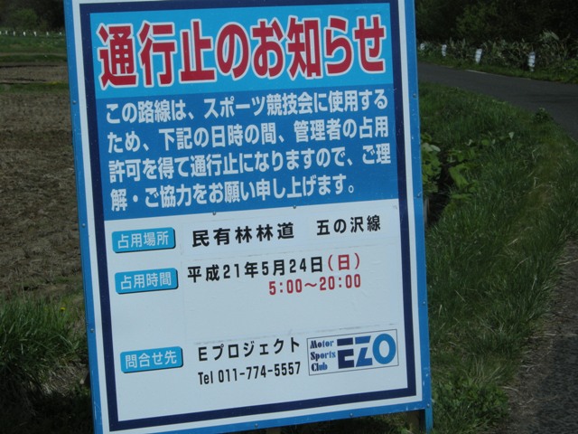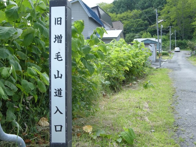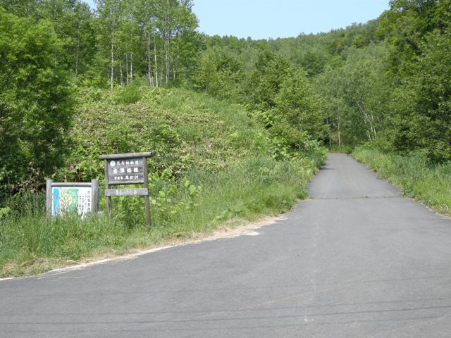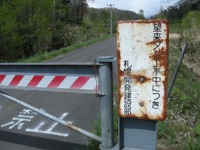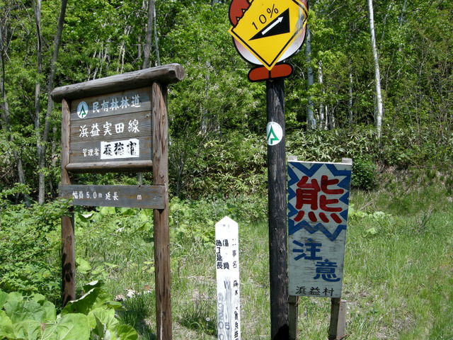 浜益側の入口は国道231号 Cafe gull から700mほど群別寄りにある。いつ行っても工事中で途中で引き返す羽目に陥ったが,2012.10.02 実田側は未舗装ながら初めて全線を走り抜けることができた。その時立っていたのがこの看板。なお,実田(於札内)側出口には判読の難しい古い標識で”群別線”とある。