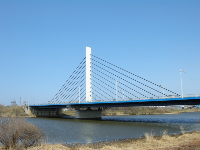 斜めに張られた左右11本ずつのハープ型のケーブルは,いつだってそれなりに絵になる光景(対岸,生振側から)だが,真横,の反対,真縦?,つまり道路の進行方向から撮ってみたくなった。大型トラックが頻繁に疾走する片側3車線の道を横切って,中央分離帯までたどり着くのは命からがら。
