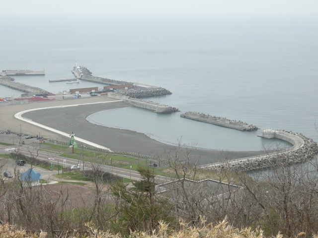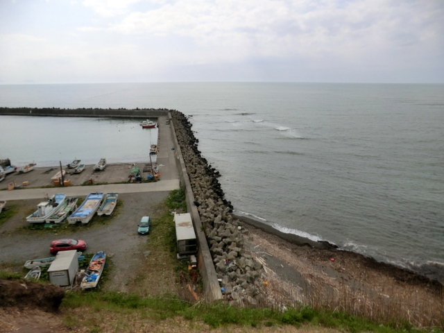 そういえば去年(2015年)5月古潭港に車を置き,押琴の浜伝い(崖の上から見る)に歩いて小谷の沢沿いのつづらおれの崖を這い上がって国道に出たことがある。古潭港に戻る途中物好きにも巨大風車を間近で見たくなって汗をかきながら高台まで歩いた。折しもなにやら作業中。近づいた年寄りを見る目には胡散臭いものを見るような警戒の色がありあり。市民風車を名乗るわりにはフレンドリーの欠片も感じられず,印象を悪くしたことをいまでも覚えている。