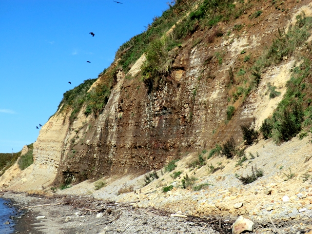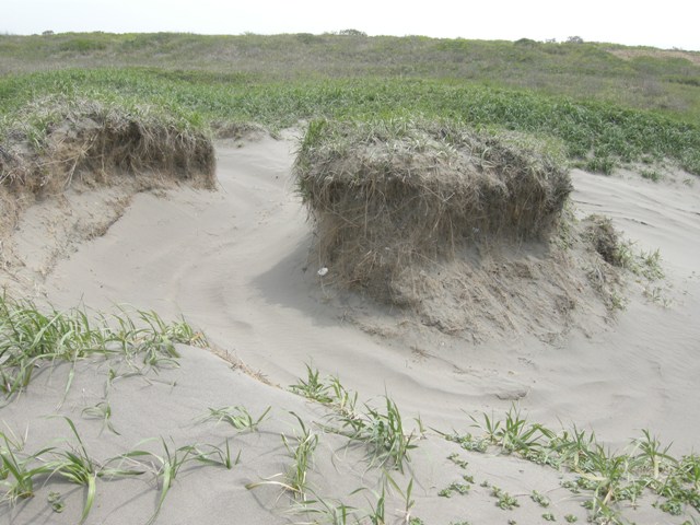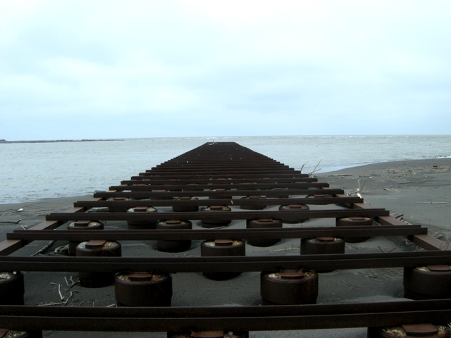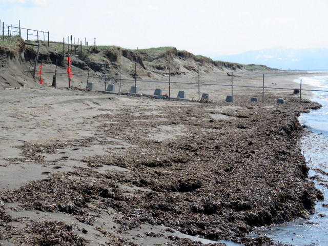 [追記3] 2015.06.08 クジラの背骨ではなくてコンクリートブロックがかなり埋まってきた。激しく浸食されたこのあたりもそろそろ堆積局面に転じたものと思われる。通常崖から汀線までの砂浜の幅は30mほどあるのだが,浸食された3,4月には10mほどにまで狭まってきていた。それが今では20mほど。半分くらい回復したといえる。