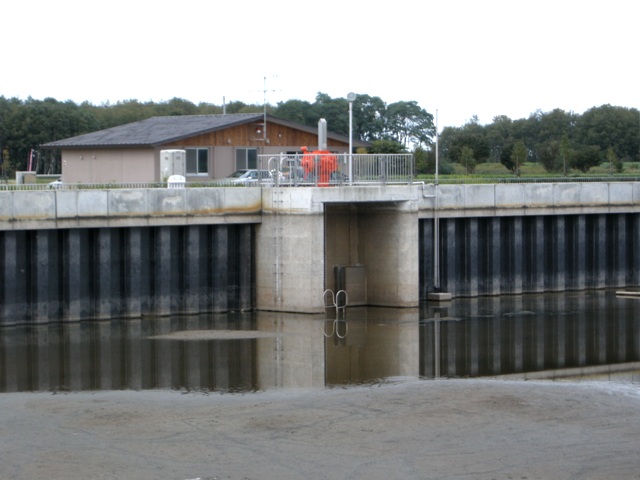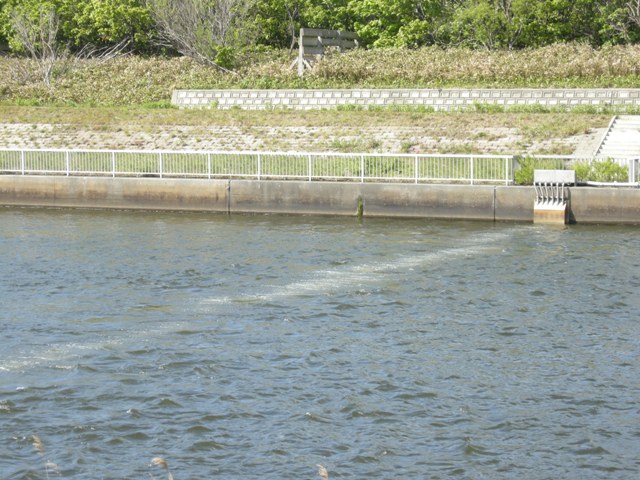 [追記3] 2017.07.03 眼鏡ではなくて一つ目小僧。実は渡船場樋門の堤外水路出口の水管。逆に,水路出口から樋門を眺める。ここから石狩河口橋までの間が河川愛護モニターの担当区間になって,おととし2015年春から眼鏡橋とともにしばしばお目にかかるようになる。水面がざわついていてくっきりとした一つ目になることは少ない。よく見ると口に見えなくもない。吸い込まれそうでこわい。向こうは石狩川。 |