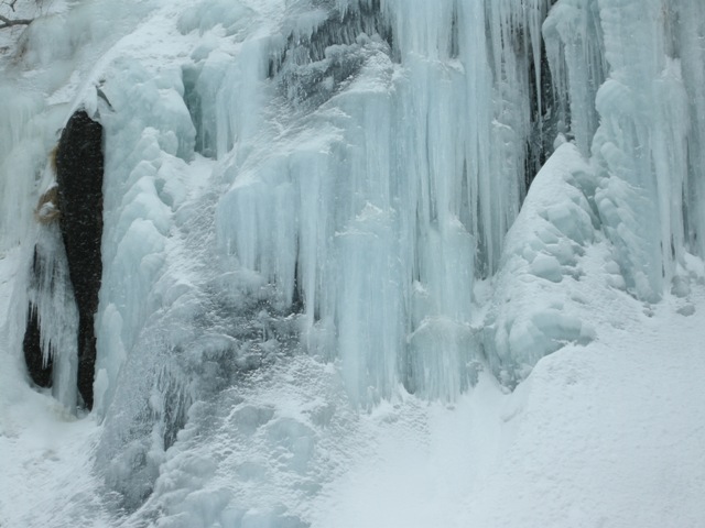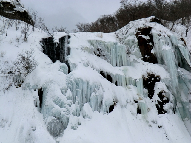 嶺泊の氷瀑も見ごたえがあるが,氷の表情がやや異なるようだ。嶺泊,古潭(ほぼ厚田川以南)あたりの崖は堆積岩であるのに対し,安瀬,濃昼(厚田川以北)では火成岩でできた崖だからだろう。滲み出てきた水が凍るか,流れ落ちてきた水が凍るかの違いのような気がする。