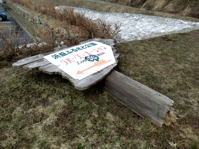 以前にもここは荒波に襲われ崩落した(2012.03.28)。柵の設置後(2012.04.21 ブロックの頭だけ露出している)。