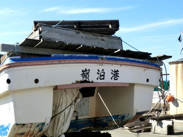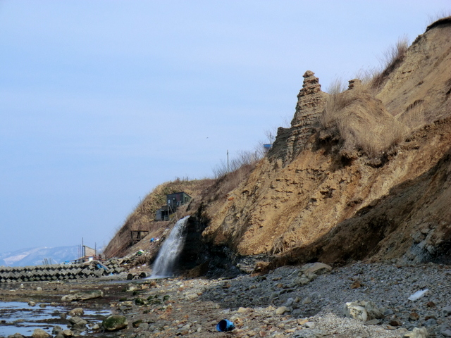 そのうちの最も嶺泊寄りの沢が,バス停「嶺泊北」のある小集落の船揚場のすぐ南側に滝となって流れ落ちている。(壊れた車が2年前とほとんど変わらぬ位置にあるのがおもしろい)