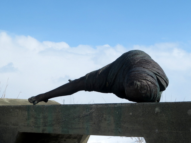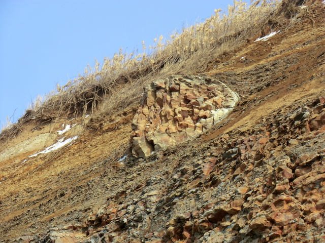 [追記8] 2016.02.25 このあたりは去年を上回るほどの激しい浸食を受けた。崖も後退,崖上に設置されていた立入禁止柵は見る影もない。崖下もえぐりとられているが,やはりコンクリートブロックは見当たらない。どこに消えたのか?もう分かっていたことだが,自然の力であれらのすべてが一斉に消えてしまったなんてとても考えにくい。私だってまだそこまで耄碌していない。つまり,答えは⑤だ。床の間に飾ってあるかは知らないが。では誰が?どうやら石狩市が撤去したらしい。良くも悪しくも設置された時代の証しでもあるだけに,邪魔だから撤去すればいいというものでもあるまい。ブロックがどれだけ頭を出しているかは,自然の猛威を推し量る指標ともなりうるものだっただけに,失われたことはとても惜しまれる。(2016.03.02