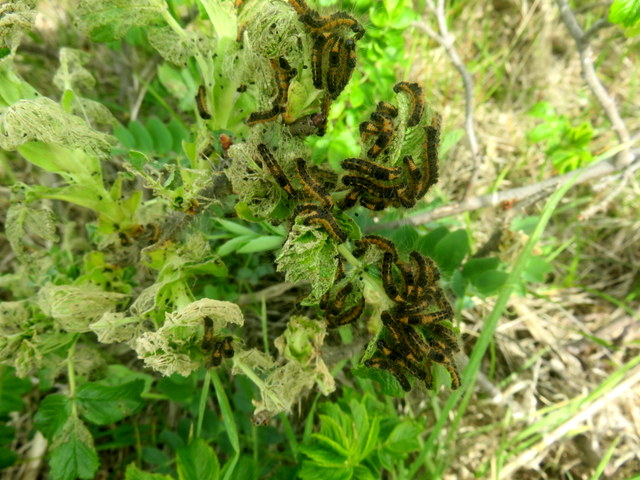 今年は東屋の周辺で大量発生している。5/14,初めて目撃してぞっとしたのも東屋を通り過ぎた草むら。そして,5/17,5/24。5/26,管理道路の東屋手前5,60mあたりの川側ではほとんどの新葉が食害されて緑の葉は残っていないほどだった。