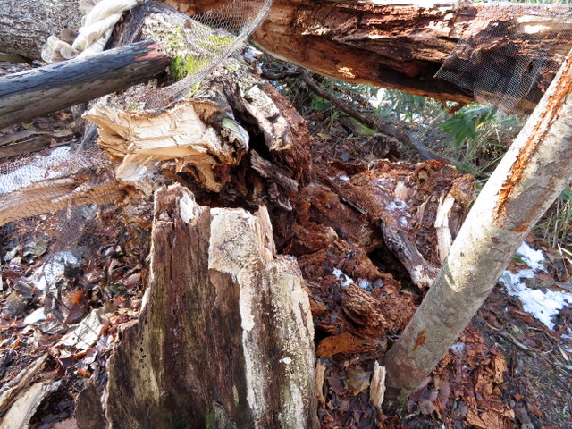 次に訪れた3/5には早くも暖気で緩んだツララは白っぽくなり輝きをうしないつつあった。それでも裏側から覗くとなかなかの迫力を感じさせるものがある。3/16では雪解け水が上から降り注ぎツララは風前の灯火状態だった。