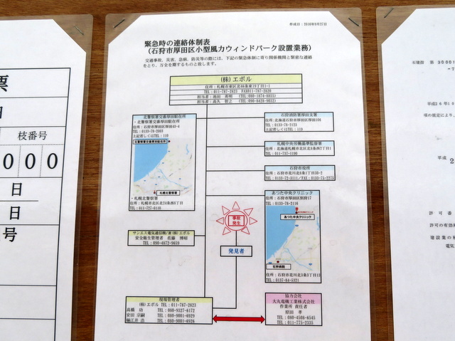 ここからおよそ1.5km離れた小谷の高台には2014年末から稼動している厚田市民風力発電の2基の風車が周囲を睥睨するかのようにそびえている。こちらは1基で2000kWという桁違いのバカでかさ。