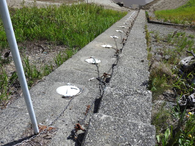 本町築堤を挟んで渡船場跡のちょうど反対側の堤内地。昨年からかなり大きな石が多数積み上げられているのに気づいてはいたが,まともに撮った写真はない。今年4/30見ると,どうやら去年のうちにすでにいくらか石垣が積み上げられている様子(去年は2度ほど講習会が行われたらしい)。