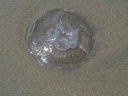 ごくありふれた種類の透け透けミズクラゲに違いない。大きいものでは20センチを超えるものもある。クラゲだけでなく,様々な漂着物を採集するビーチコーミングも楽しい。ささやかな収穫物:石炭,木片とクルミ。