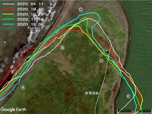 砂嘴先端は2019年秋からの激しい浸食により大きく後退している。