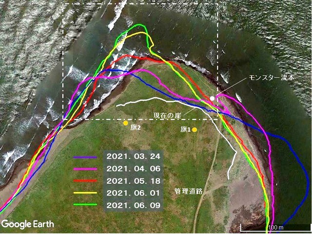 ここで黒線は Google earth 背景図から得られた2021.07.09時点での浜崖のラインで現在も変化がないものと思われる。