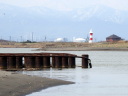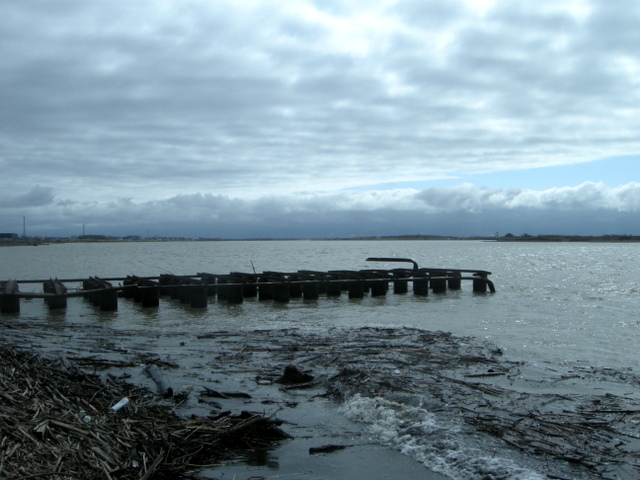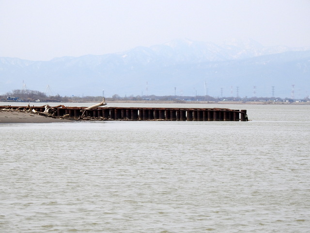 それはさておき3,4月すでに合わせて7回もこの辺りに足を運んでいる。それというのも,波浪観測所跡の基礎コンクリート遺構と,第一突堤に会いたいがため。なのに3/11に波のまにまに第一突堤が見えたのみ。波浪観測所跡は昨年12/12以降海面下に姿を消してしまったようだ。(右岸の異変)