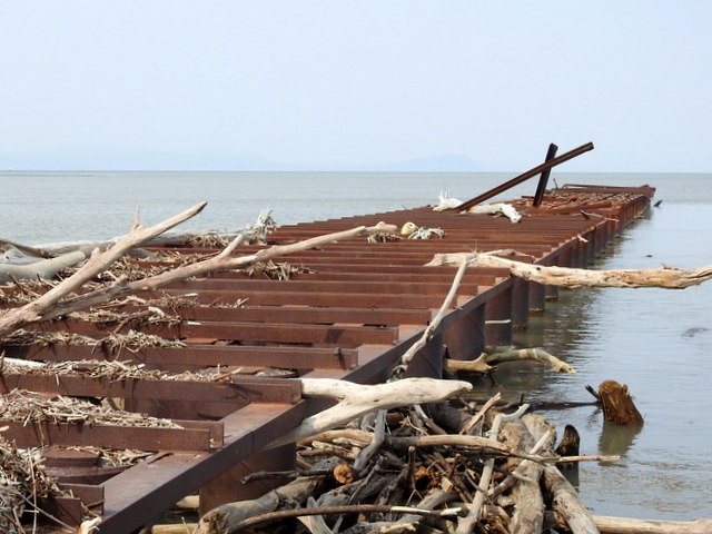 護岸されていない河口右岸がこれだけ浸食されているということは,より先端にある河口導流堤への波浪の負荷も相当厳しいものと思われ,近年その痛みが激しいこともうなずける。