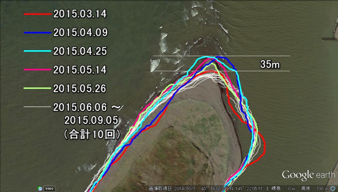 2015年3月の浸食部分とわずかにオーバーラップしているが,微妙に砂嘴先端方向にずれている。