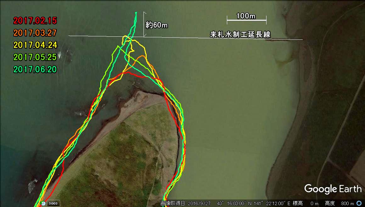 4/24には2/15のレベルから早くも100m近く伸びて,2014年秋以来久々来札水制工延長線を(ちょっとだけ)突き抜けた。