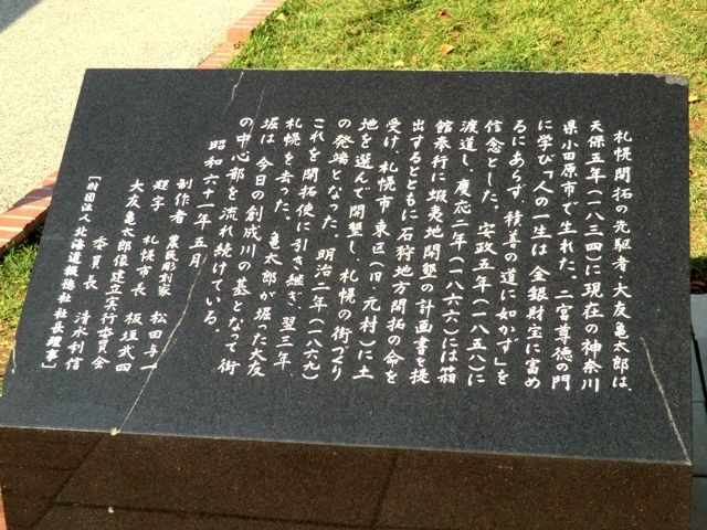 亀太郎像が役宅跡すなわち札幌村郷土記念館前に引っ越してきたのは,創成川公園の整備(南北ふたつのアンダーパスの連続化工事)が開始された2005年(平成17年)のこと。