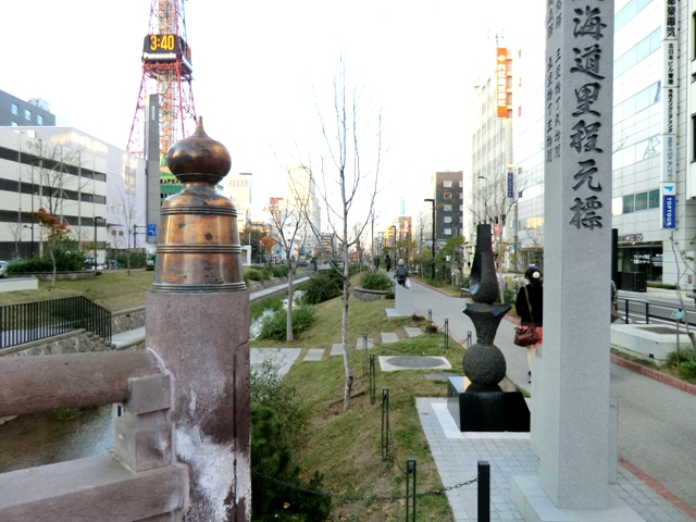北海道里程元標は復元された創成橋の右岸たもとに立てられている。