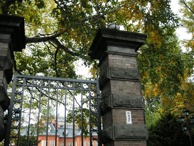 正門前を東にのびる北3条通りは「札幌舗装道路発祥の地」でもあるとのこと。(説明板) [この行 2008.07.20]