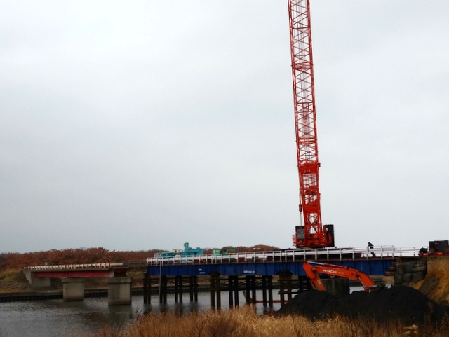 左岸側では既設のP5からP6,P7橋脚へ向けて橋桁を架ける上部工事が始まっていた。