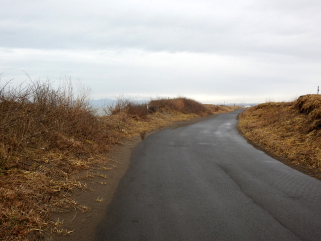 c(a) 市道灯台線,砂嘴先端方向を見る。右にマウニの丘。左が海。崖が迫る。
