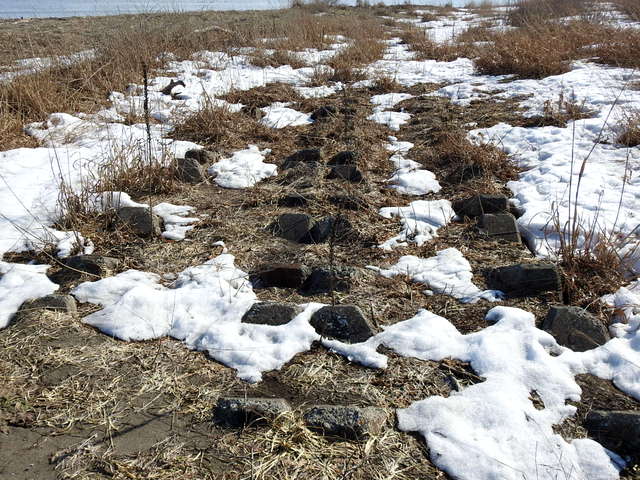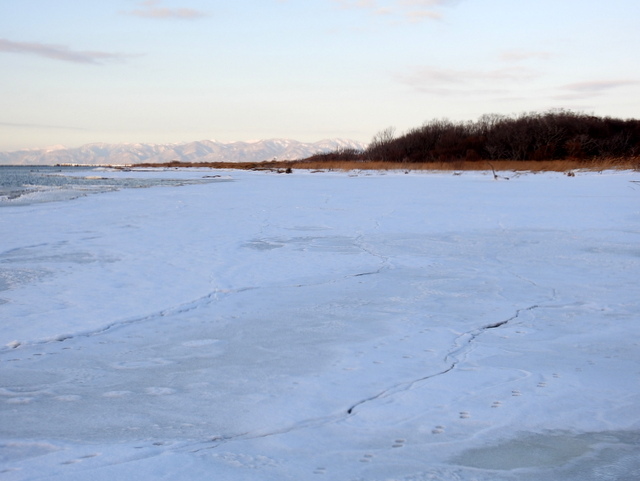 トドの島堤20日にはとても近づけなかった石狩樽川海岸線,今日(3/24)はほとんど雪も解けていた。