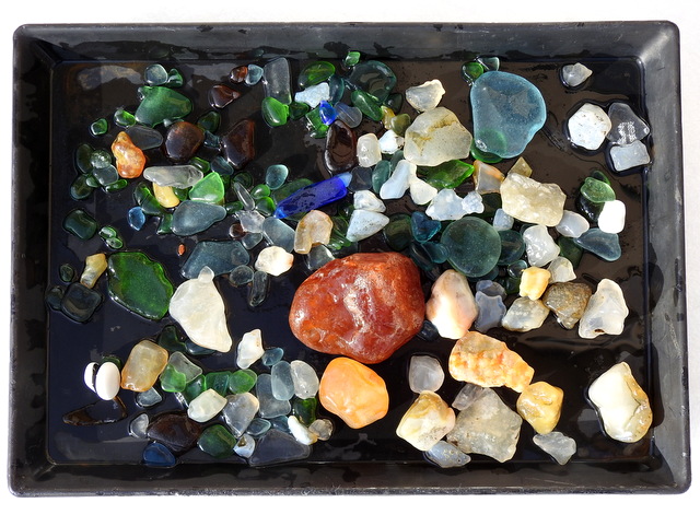 押琴では石っころ拾い。今日の成果。ビーチグラスが多いけど。