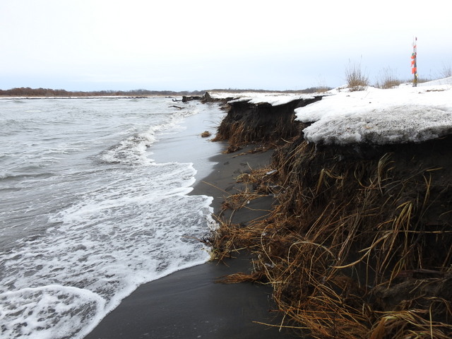 (c) 砂嘴先端の浜崖はさらに浸食され,露出したハマニンニクの根などが凍りつく。まるで純白の花が咲いたよう。